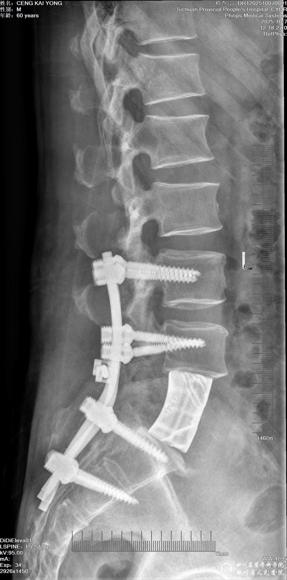 小心翼翼剥离肿瘤与周围血管的粘连,精准避开重要血管分支,严防出血风险;再精细分离受肿瘤压迫的神经,确保神经功能不受损伤;完整切除病变的椎体及肿瘤组织,彻底解除压迫。随后植入椎弓根螺钉与患者腰椎参数匹配的3D打印人工锥体,完成脊柱稳定性重建。整个手术操作精准到毫米,团队配合默契,出血量远低于预期,重要血管与神经功能完好。