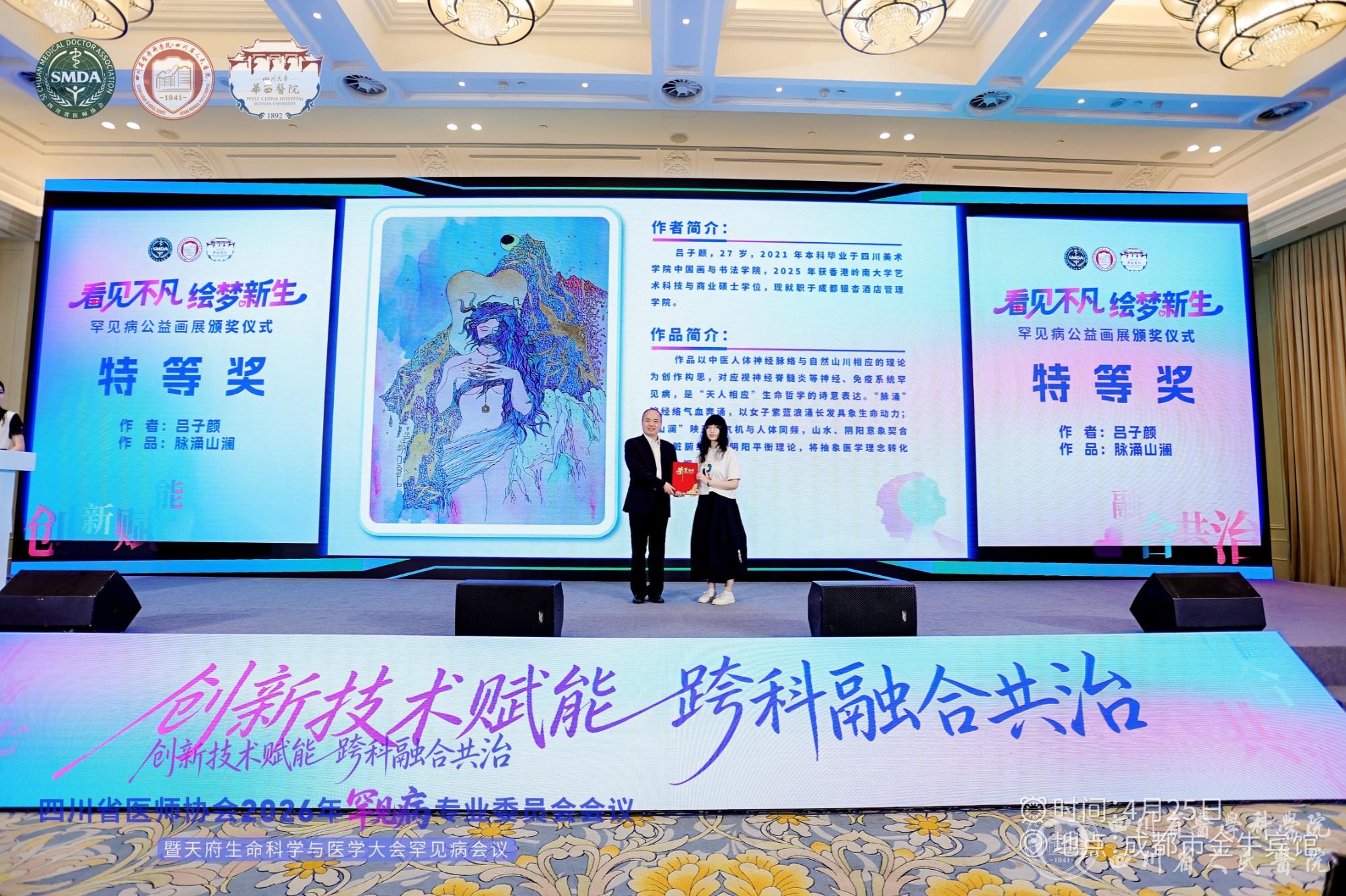 活动发布后,爱心源源不断汇聚,共收到近100份饱含温度的作品。经过专业评审,评选出特等奖1名、一等奖3名、二等奖5名、三等奖7名及优秀奖若干。4月25日,在“四川省医师协会罕见病专业委员会会议暨天府生命科学与医学大会罕见病会议”期间,同步开展优秀作品展览并举行颁奖仪式,近 60 幅动人作品在此亮相。中国科学院院士、我院党委书记杨正林,四川省医师协会副会长王献民等出席活动,为获奖者送上荣誉与祝福。