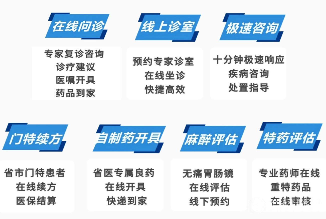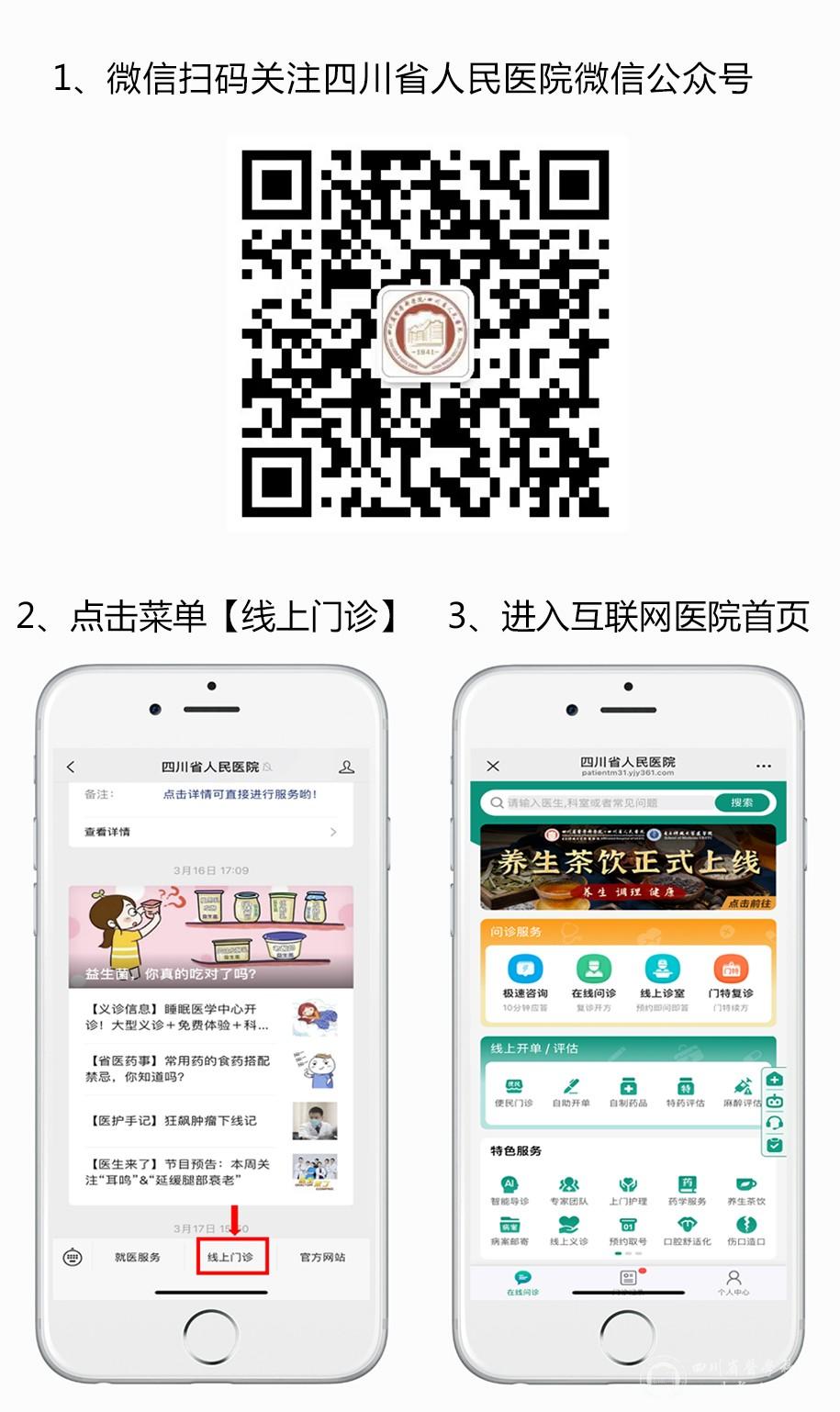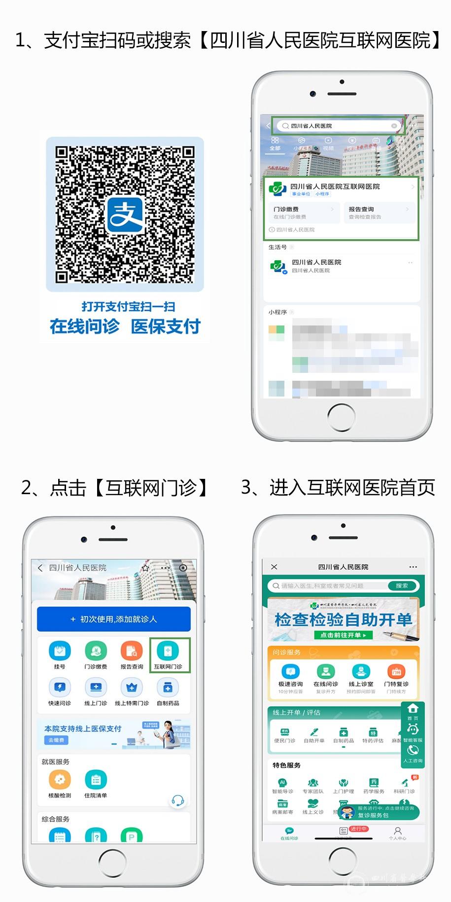 一、微信入口二、支付宝入口三、主要服务功能四、注意事项互联网医院可为病情稳定的复诊患者提供在线务,以下事项需特别注意:1、互联网医院药品配送为定点定时配送,如急需药品可到院自提,暂不支持闪送服务;2、6岁以下儿童可在线咨询,如需在线开方需要有医师陪同才能开具;3、自助开单页面可提供新冠核酸检测自助开单服务(急诊可做,但只能工作日工作时间提供检查服务,检查地点在急诊大楼)。五、互联网医院咨询电话028-87394676(工作日 9:00-12:00,14:00-18:00)